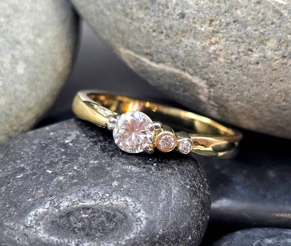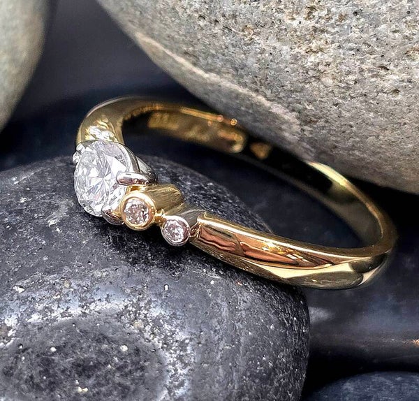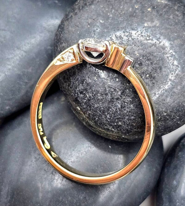 Elegant, modern, and beautifully balanced — this 18ct gold and platinum diamond ring is a truly unique handcrafted piece. At its heart sits a brilliant 0.40pt G–H VSi round diamond, accented by four smaller diamonds that enhance its sparkle and highlight the asymmetric design.