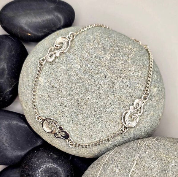 Simple, elegant, and beautifully detailed — this sterling silver scroll and chain bracelet combines three intricate scroll links with a fine curb chain for a delicate and timeless look. The mix of smooth silver and detailed scrollwork creates subtle texture and charm, perfect for everyday wear or layering with other bracelets.