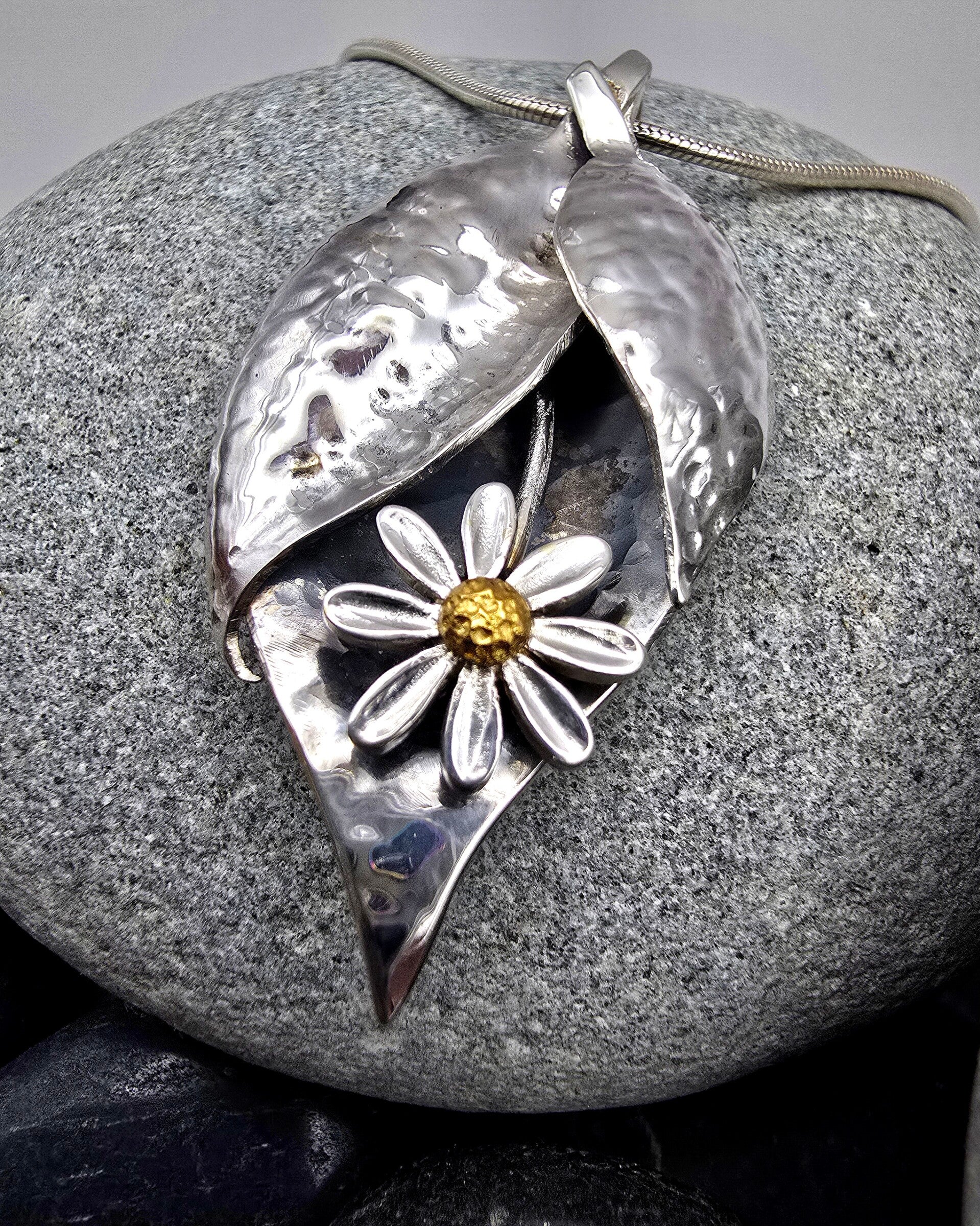 - Design: Hammered silver leaves surrounding a daisy motif