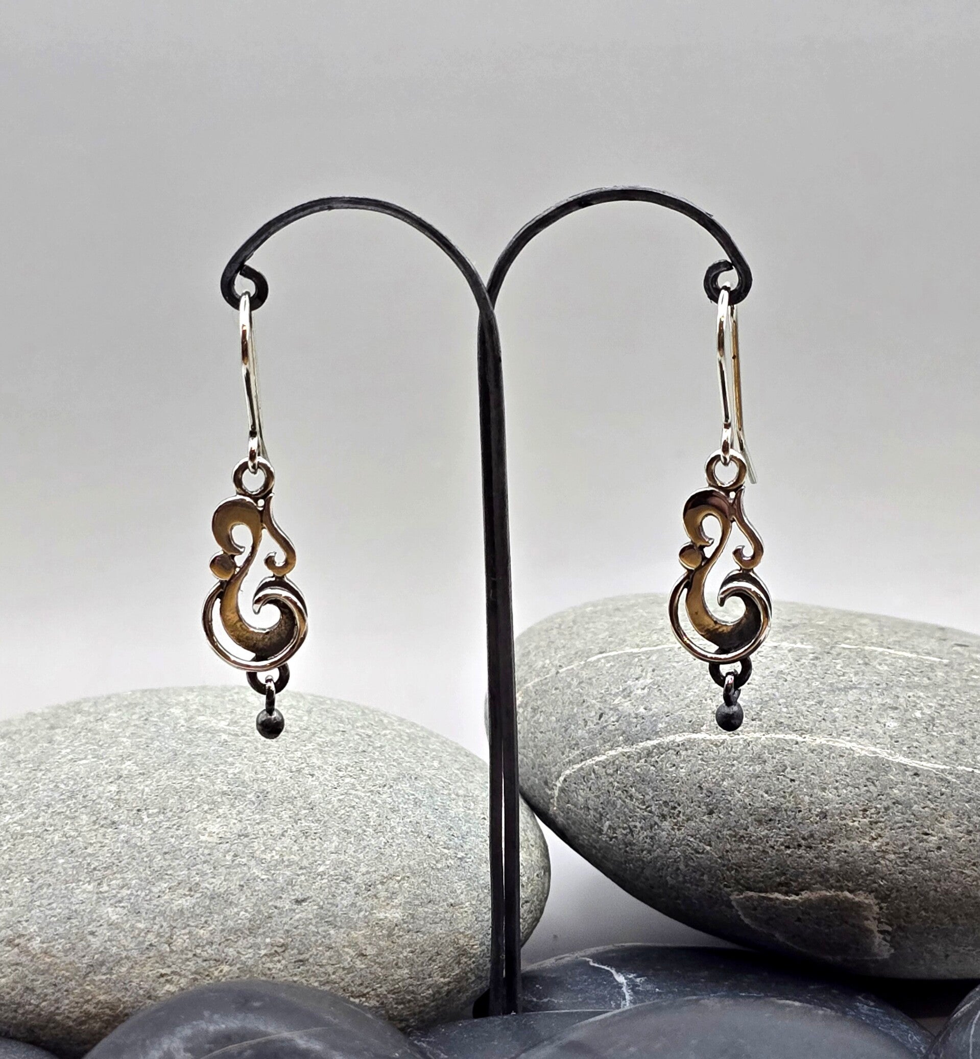 Full of movement and personality, these sterling silver scroll earrings showcase the flowing scrollwork and curls that are truly my signature style. Each earring features graceful hand-shaped scrolls with small blackened silver balls delicately hanging from the bottom — adding depth, contrast, and a touch of character.