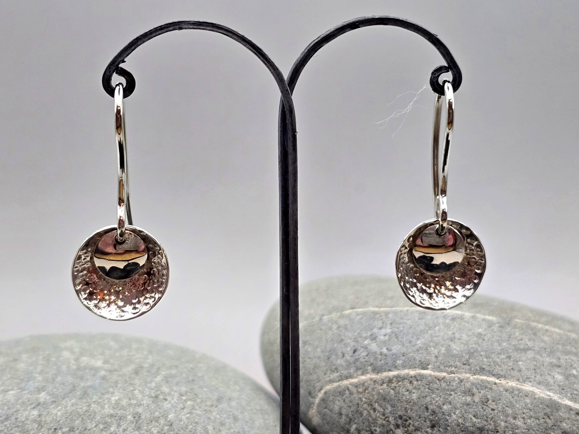 These sterling silver hammered disc earrings feature a clever, layered design that catches the light beautifully. Each earring has a hammered domed disc paired with a smaller polished dome facing the opposite direction, creating depth, texture, and a subtle shimmer as they move.