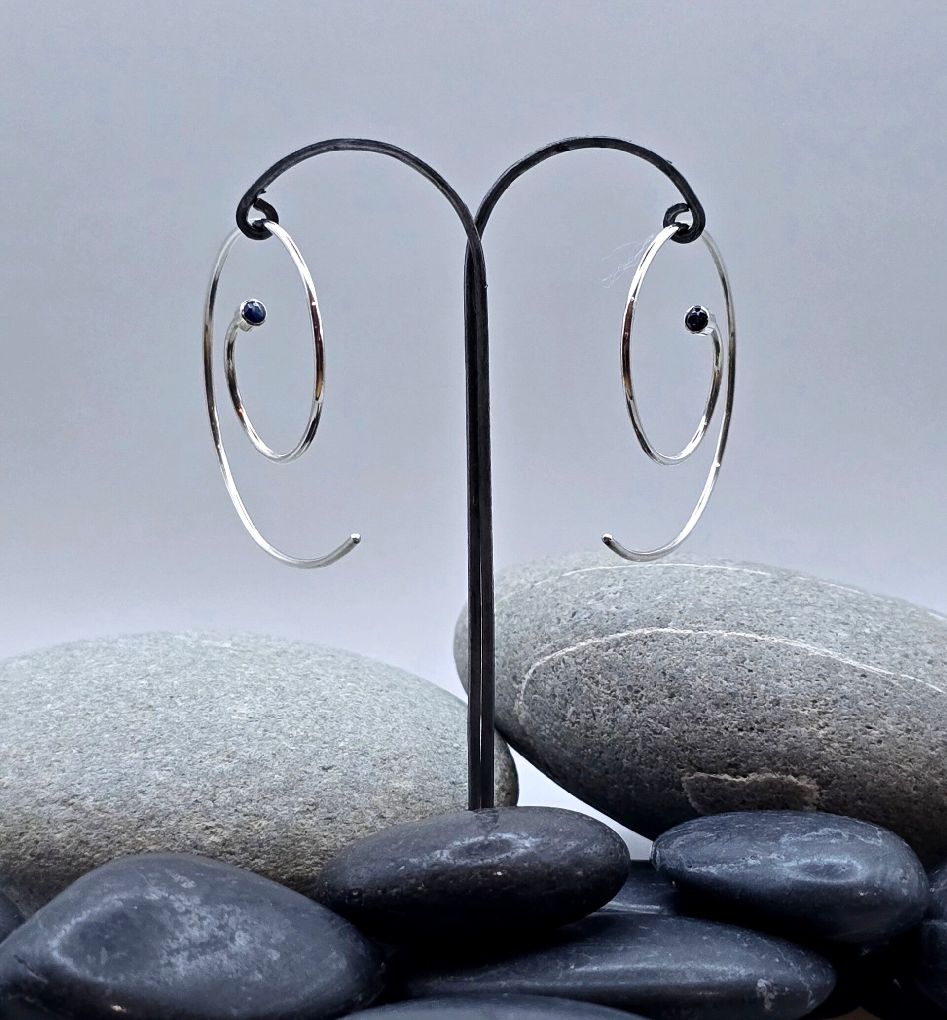 Modern, minimal, and just a touch magical — these silver and sapphire spiral hoops are a fresh take on a timeless favourite.