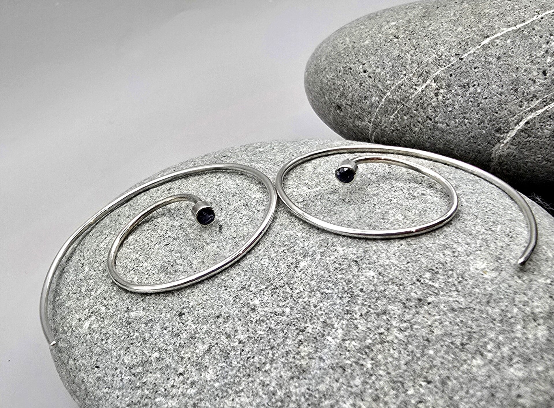 A playful twist on a classic — these sterling silver spiral hoop earrings are beautifully unique. Handcrafted from fine 1mm silver wire, each hoop curls into a perfect spiral, finished with a small sapphire set into each end for a subtle touch of colour and sparkle.