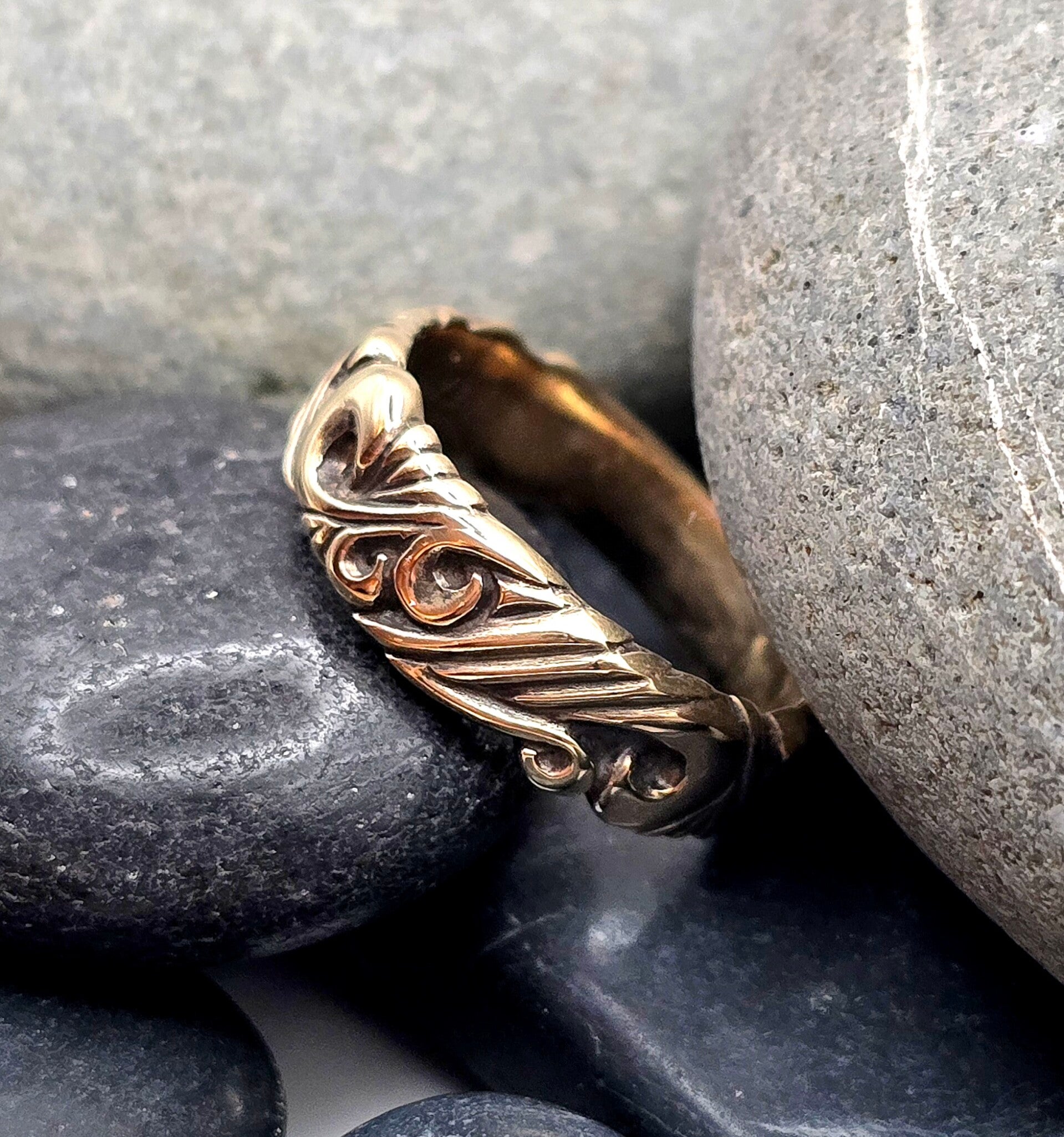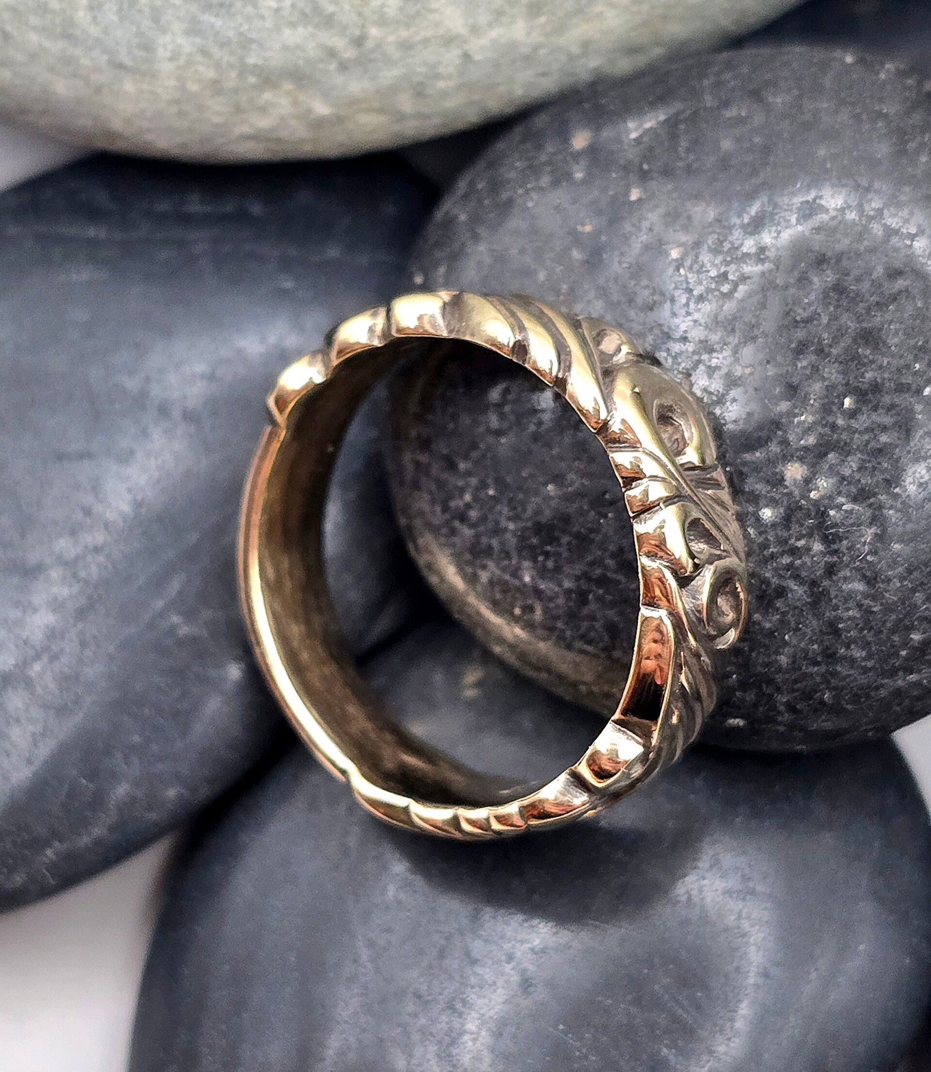 Handcrafted in solid 9ct gold, this ring feels substantial yet comfortable, with a smooth inner band and delicate raised scrolls that catch the light beautifully. Ideal as a unique wedding band, everyday ring, or heirloom-style piece.