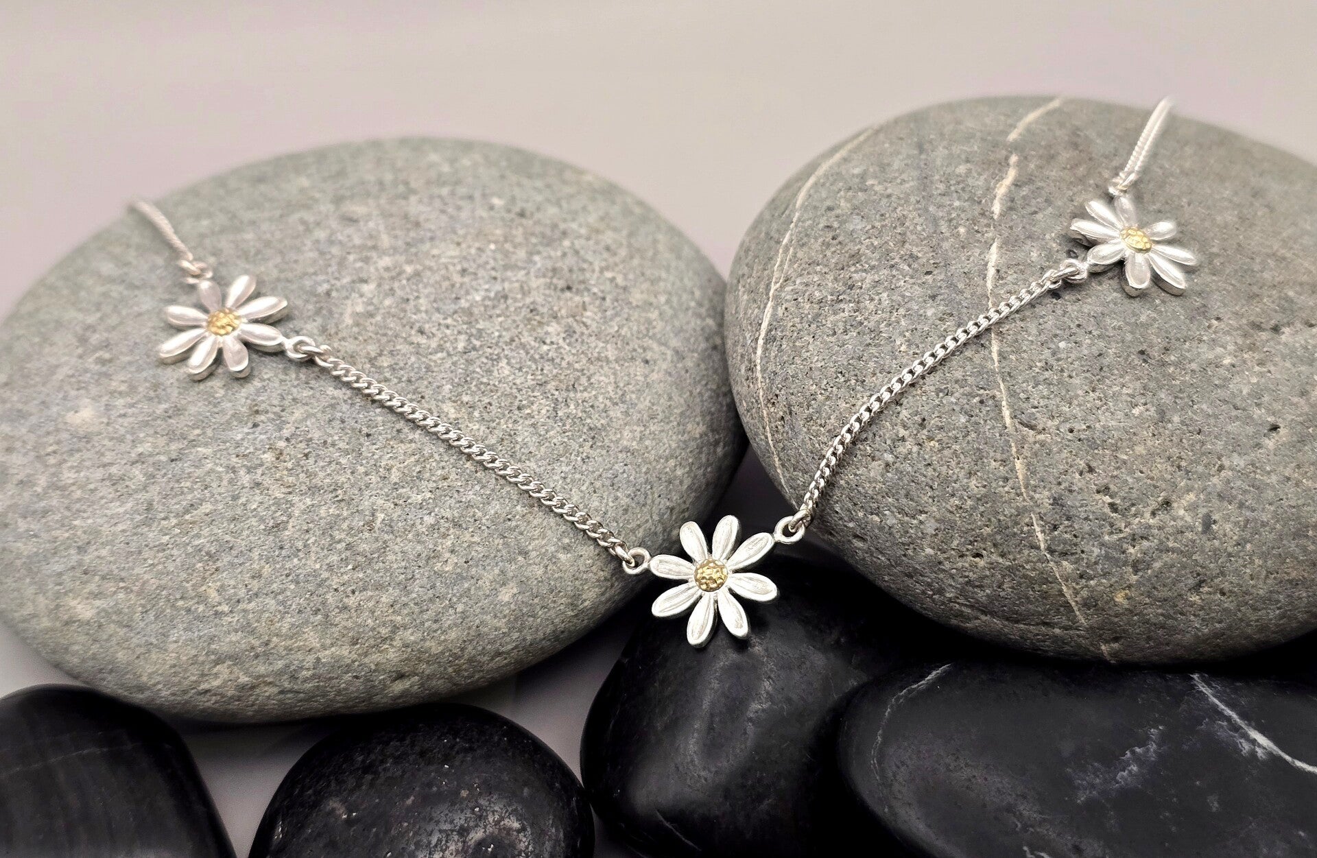 Bright, cheerful, and full of charm — this Daisy Chain Necklace is made to make you smile. Three sweet silver daisies, each with a glowing 18ct yellow gold centre, sit perfectly spaced along a fine silver curb chain. The daisies are fixed in place, so they stay exactly where they’re meant to be, creating a simple yet eye-catching line of sparkle. It’s the perfect everyday necklace for lovers of floral jewellery, handmade silver pieces, and anything delightfully dainty.