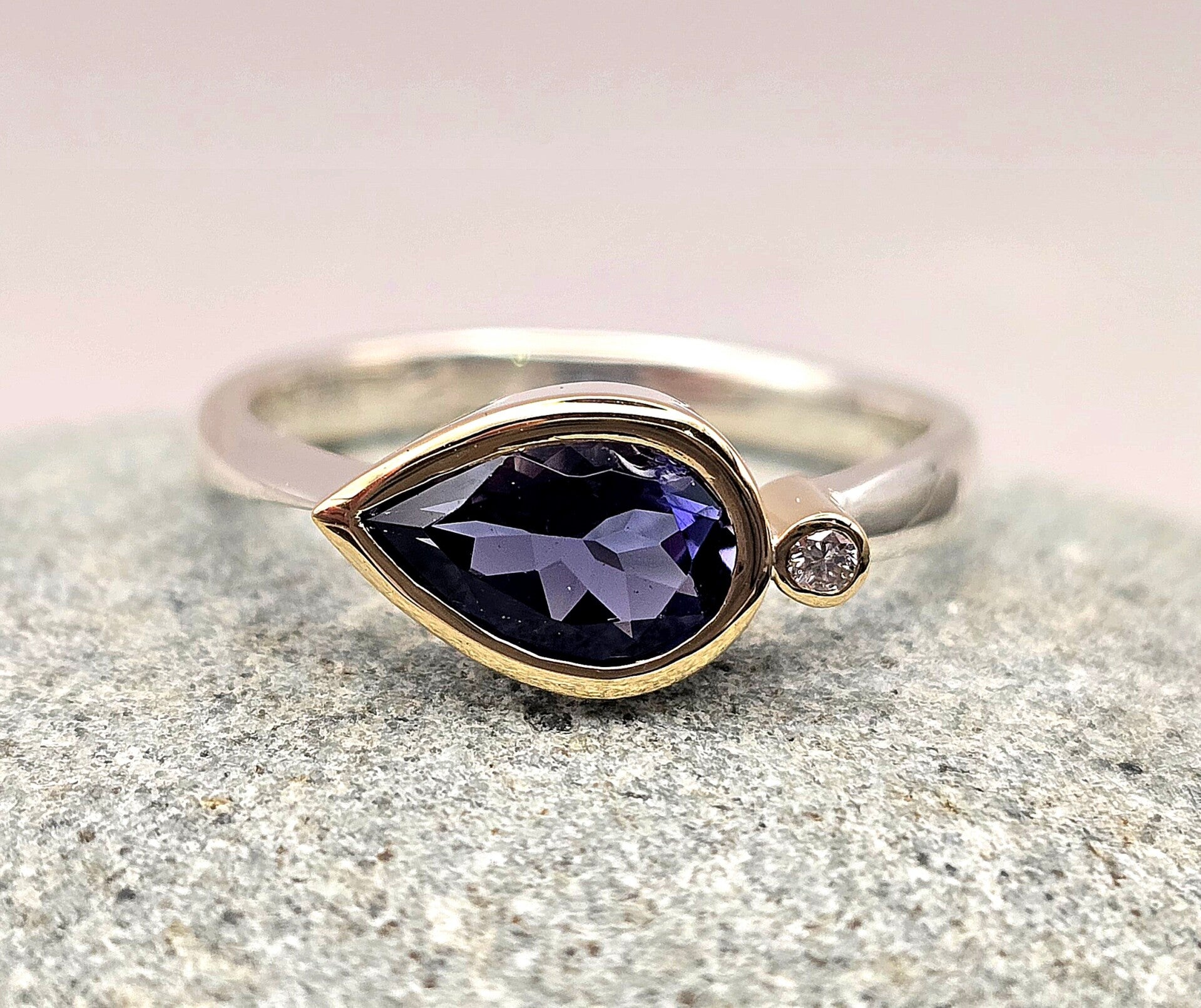 Iolite & Lab-Grown Diamond Pear Ring – Silver & 18ct Yellow Gold