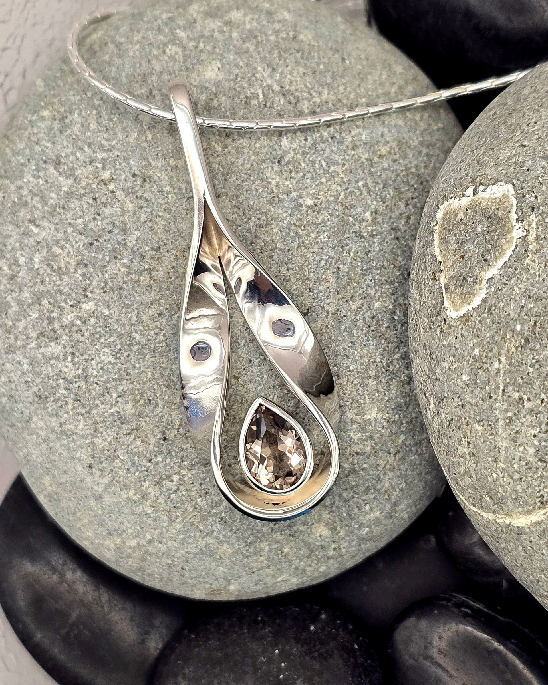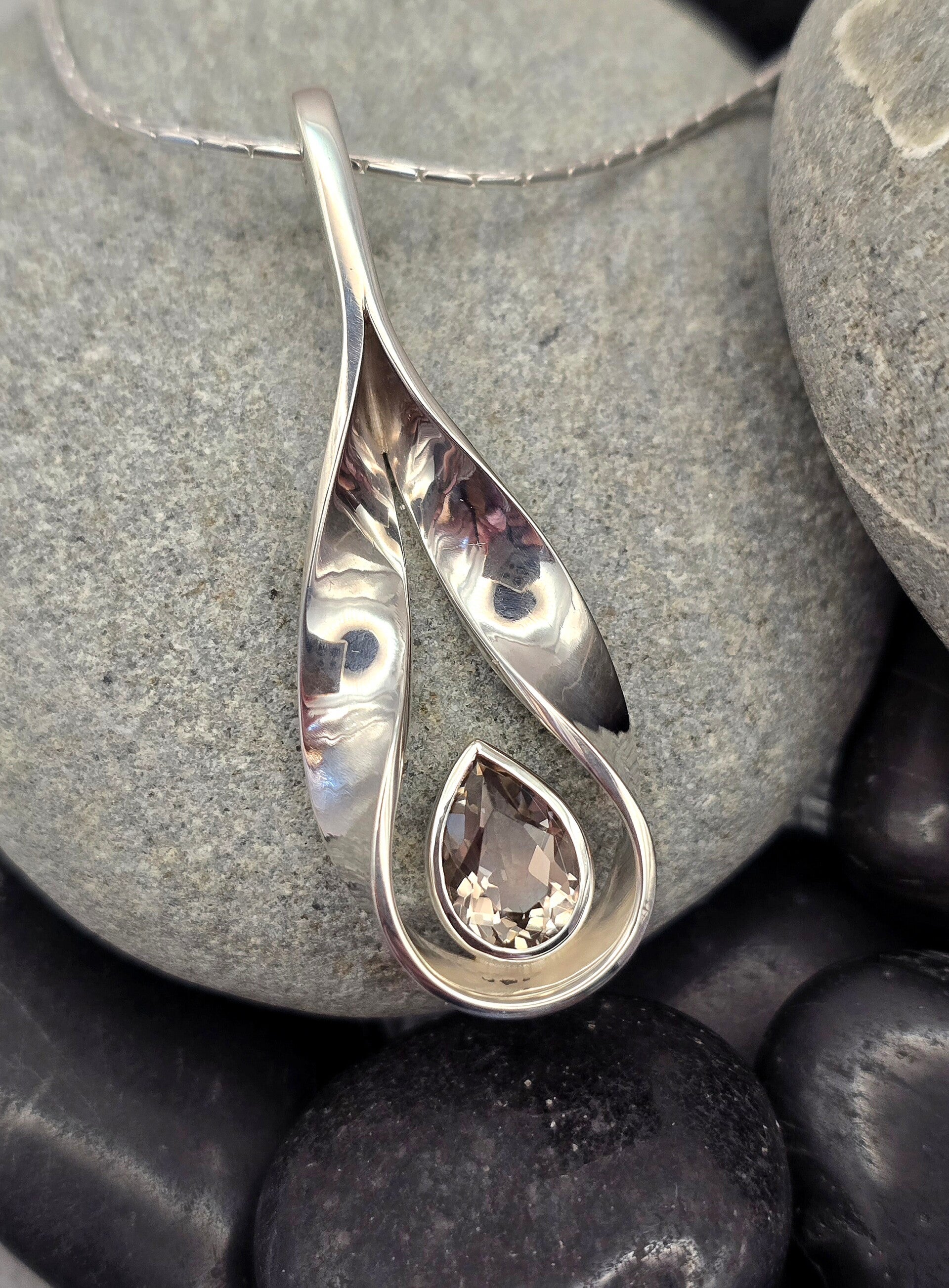 A striking one-off pendant featuring a beautiful pear-shaped smokey quartz set within an elegant twist of silver. The flowing form frames the stone perfectly, creating a piece that feels both bold and refined. A unique design for someone who appreciates jewellery that isn’t ordinary.