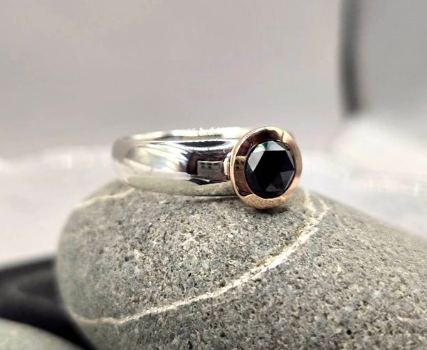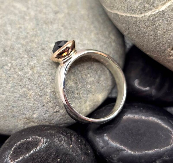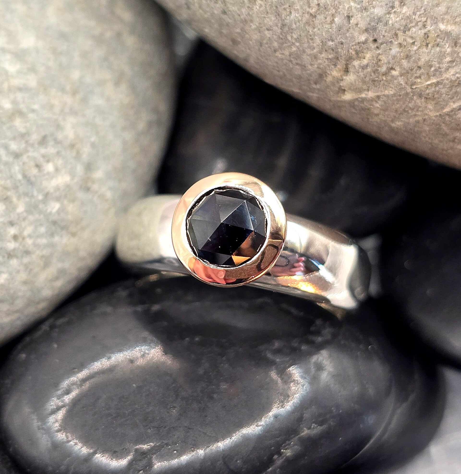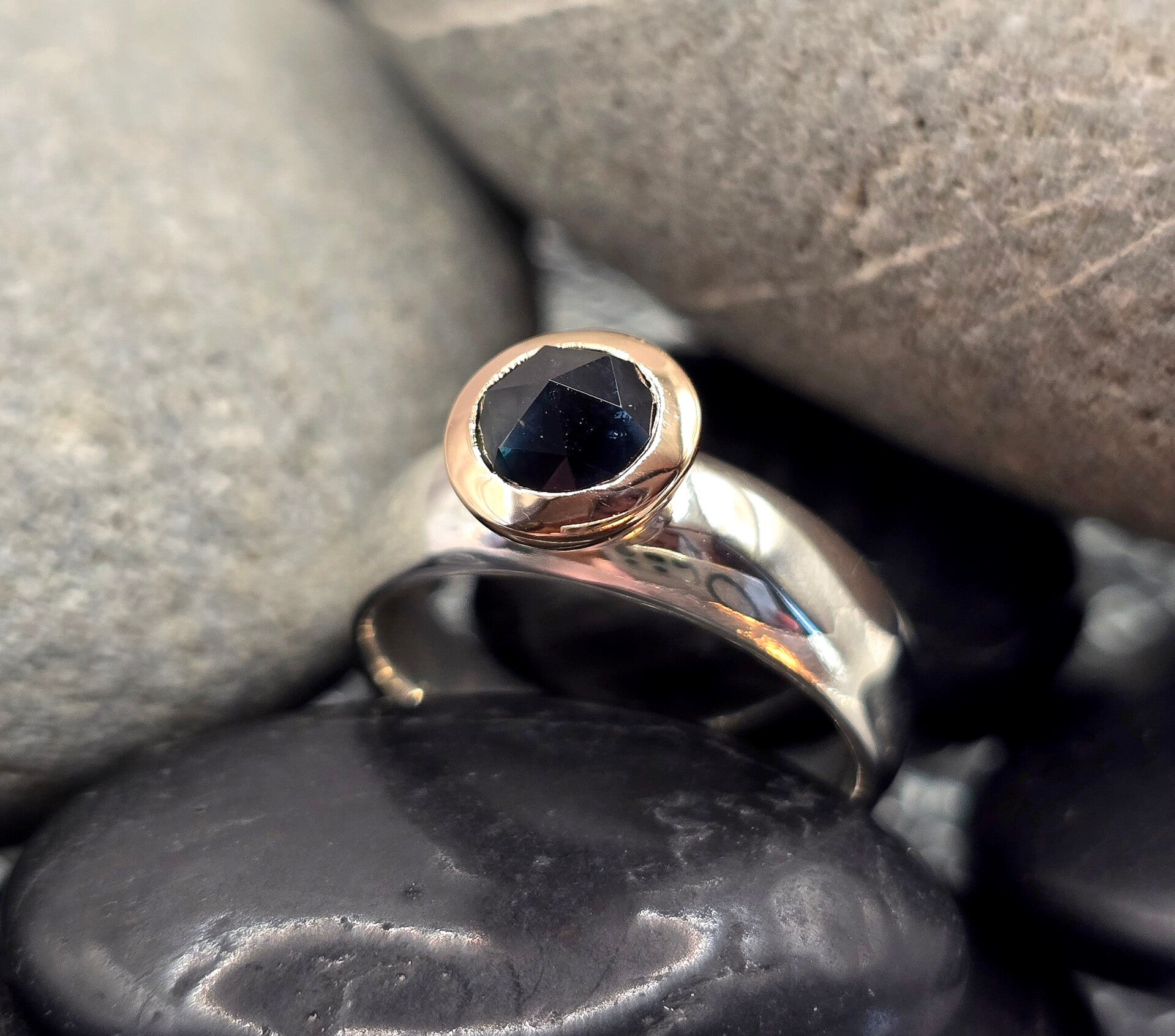 A striking deep blue rose cut sapphire, set in warm 9ct rose gold and framed in a smooth rubover setting. Sitting proudly atop a solid, weighty band, this piece balances strength with understated elegance.